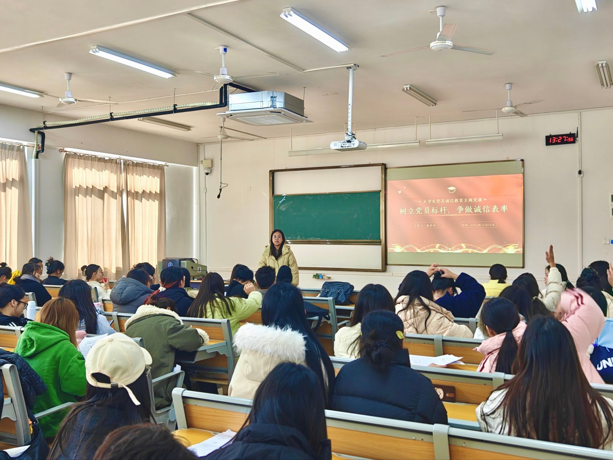 為嚴(yán)肅考試紀(jì)律、弘揚(yáng)誠(chéng)信精神,充分發(fā)揮學(xué)生黨員的先鋒模范作用,營(yíng)造公平健康的考試環(huán)境,12月25日,學(xué)院學(xué)生第一、二、三黨支部在探天樓C402教室聯(lián)合舉辦“樹(shù)立黨員標(biāo)桿,爭(zhēng)做誠(chéng)信表率”主題黨課。黨課由黨支部書(shū)記崔丹丹主講,全體學(xué)生黨員參加。