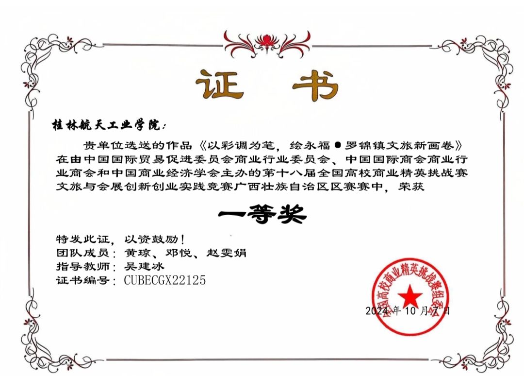 我院酒店管理、旅游管理與服務(wù)教育、旅游管理、播音與主持藝術(shù)等專業(yè)學(xué)生積極參賽,共推薦16支隊伍70余名學(xué)生參加區(qū)賽,經(jīng)過激烈角逐,最終獲得三等獎以上獎項14項(一等獎5項,二等獎6項,三等獎3項),其中一等獎、二等獎作品共11項推薦參加全國總決賽。桂林航天工業(yè)學(xué)院獲得全國高校商業(yè)精英挑戰(zhàn)賽文旅與會展創(chuàng)新創(chuàng)業(yè)實踐競賽(廣西區(qū)賽)優(yōu)秀組織獎。