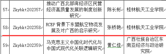 根據(jù)自治區(qū)社科聯(lián)關(guān)于2023年度廣西社科界智庫重點(diǎn)課題(一般項(xiàng)目)立項(xiàng)的通知,經(jīng)專家組評審,公示無異議,學(xué)院張橋艷老師申報(bào)的“RCEP背景下東盟航空物流發(fā)展及對廣西的啟示研究”課題獲批立項(xiàng),具體見附件。